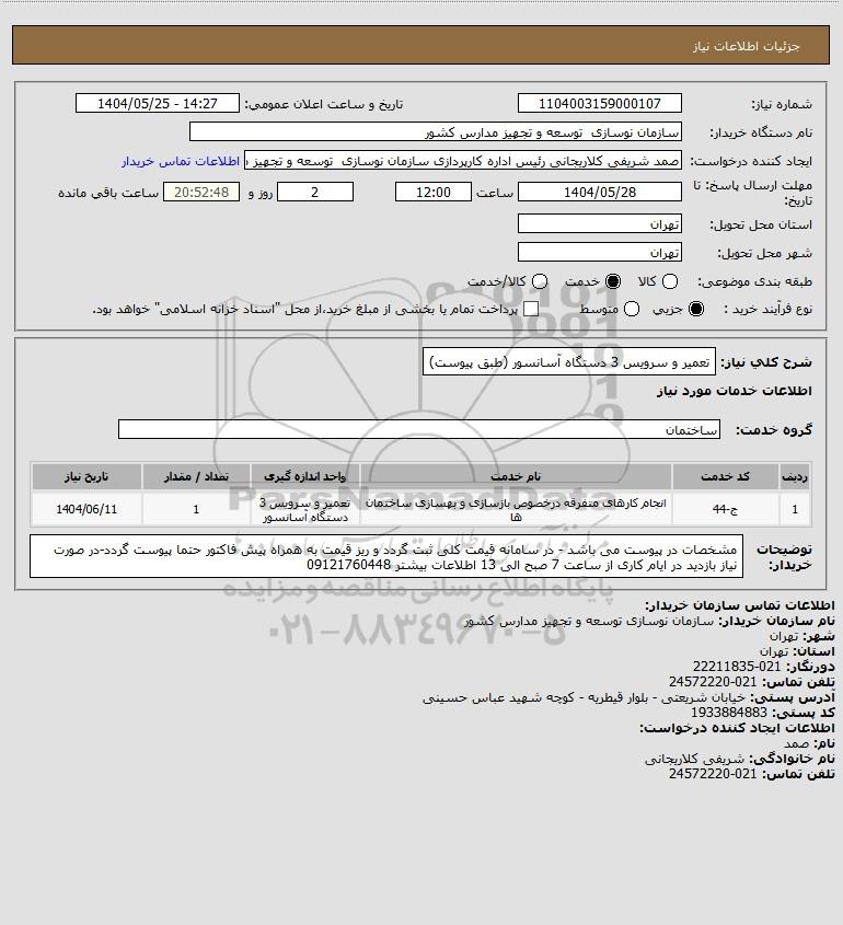 شرح کلی نیاز: تعمیر و سرویس 3 دستگاه آسانسور (طبق پیوست)