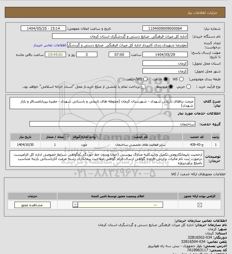 نام دستگاه خریدار:اداره کل میراث فرهنگی صنایع دستی و گردشگری استان کرمان