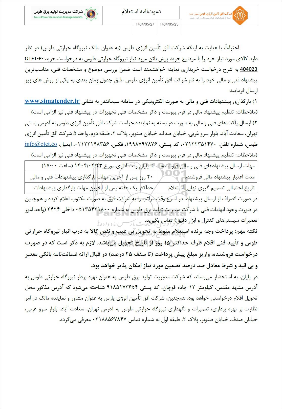 احتراماً با عنایت به اینکه شرکت افق تأمین انرژی طوس (به عنوان مالک نیروگاه حرارتی طوس) در نظر دارد کالای مورد نیاز خود را با موضوع خرید پوش باتن مورد نیاز نیروگاه حرارتی به درخواست خرید 404023-OTET-P به شرح درخواست خریداری نماید؛ خواهشمند است ضمن بررسی موضوع و مشخصات فنی مناسب ترین پیشنهاد فنی و مالی خود را به نام شرکت افق تأمین انرژی طوس طبق جدول زمان بندی به یکی از روش های زیر ارسال فرمایید: