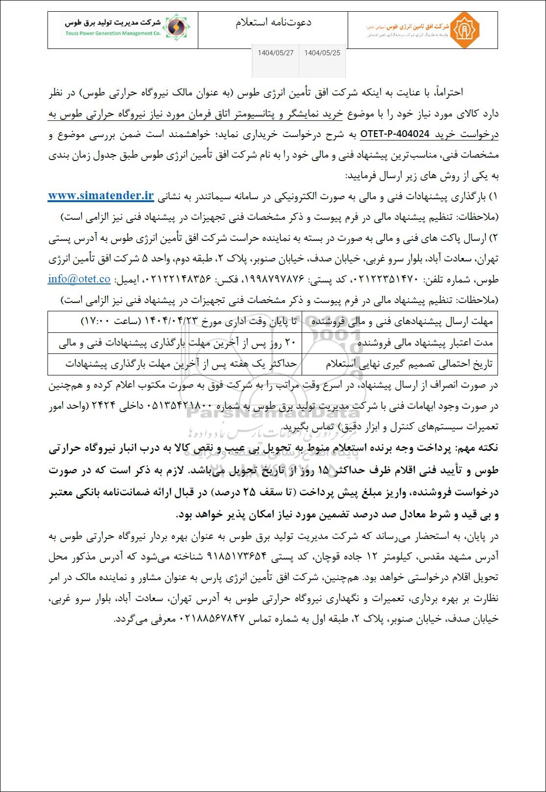 احتراماً با عنایت به اینکه شرکت افق تأمین انرژی طوس (به عنوان مالک نیروگاه حرارتی طوس) در نظر دارد کالای مورد نیاز خود را با موضوع خرید نمایشگر و پتانسیومتر اتاق فرمان مورد نیاز نیروگاه حرارتی  به درخواست خرید 404024-OTET-P به شرح درخواست خریداری نماید؛ خواهشمند است ضمن بررسی موضوع و مشخصات فنی مناسب ترین پیشنهاد فنی و مالی خود را به نام شرکت افق تأمین انرژی طوس طبق جدول زمان بندی به یکی از روش های زیر ارسال فرمایید: