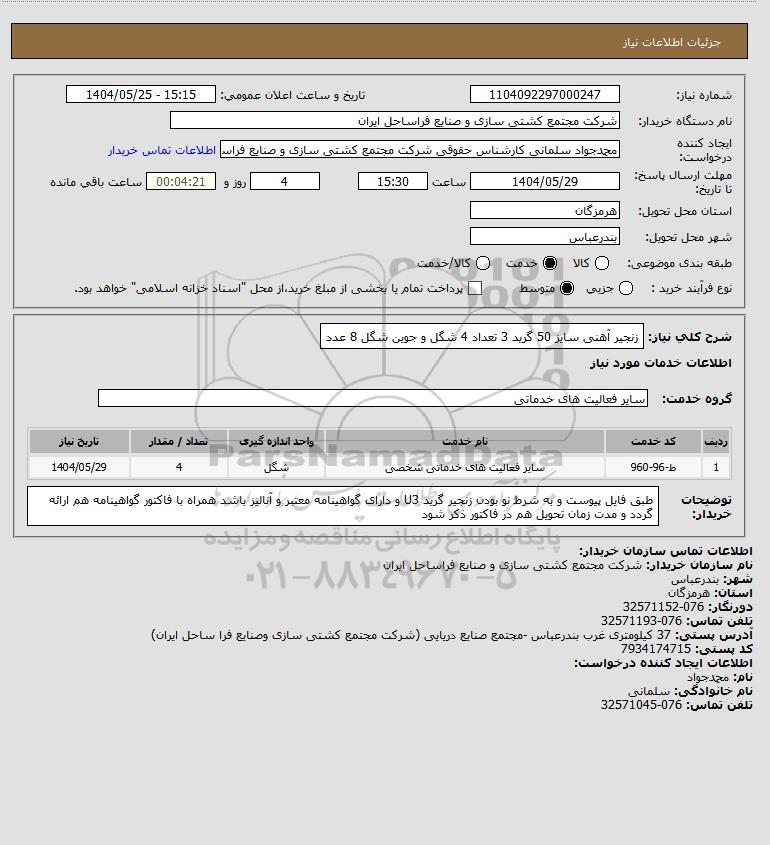 شرح کلی نیاز: زنجیر آهنی سایز 50 گرید 3 تعداد 4 شگل و جوین شگل 8 عدد