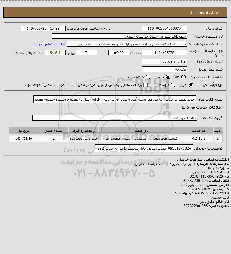 شرح کلی نیاز: خرید تجهیزات شامل دوربین مداربسته آنتن و سایر لوازم جانبی -کرایه حمل به عهده فروشنده -تسویه نقدی