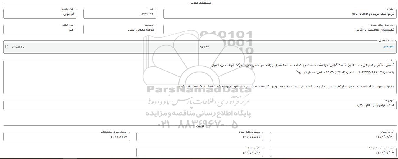 فراخوان استعلام خرید دو gear pump , فراخوان استعلام خرید دو gear pump