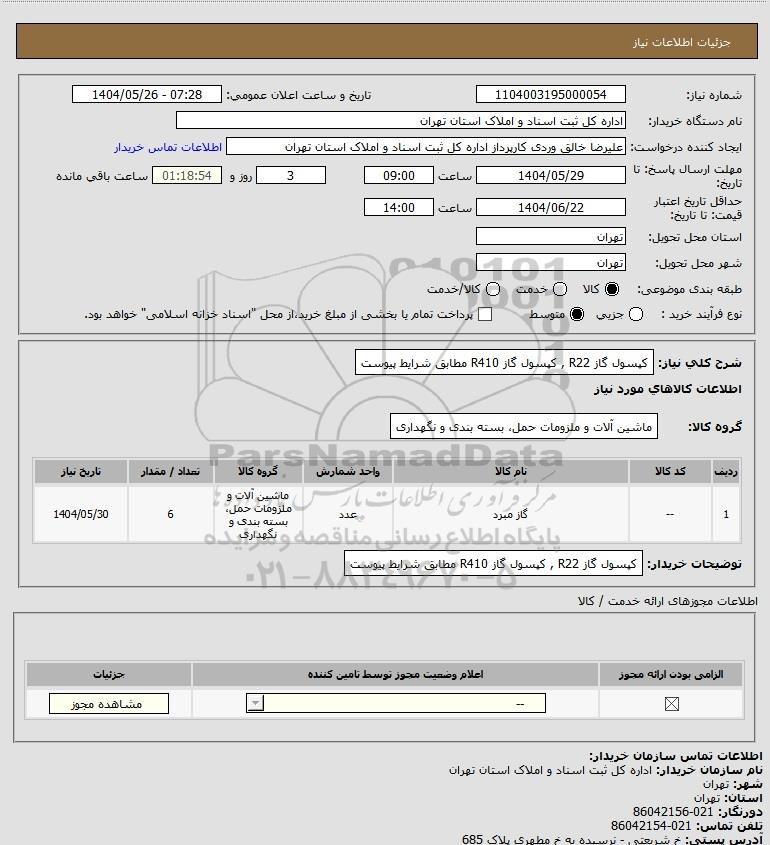 | 1 | -- | گاز مبرد | عدد | ماشین آلات و ملزومات حمل، بسته بندی و نگهداری | 6 | 1404/05/30 |