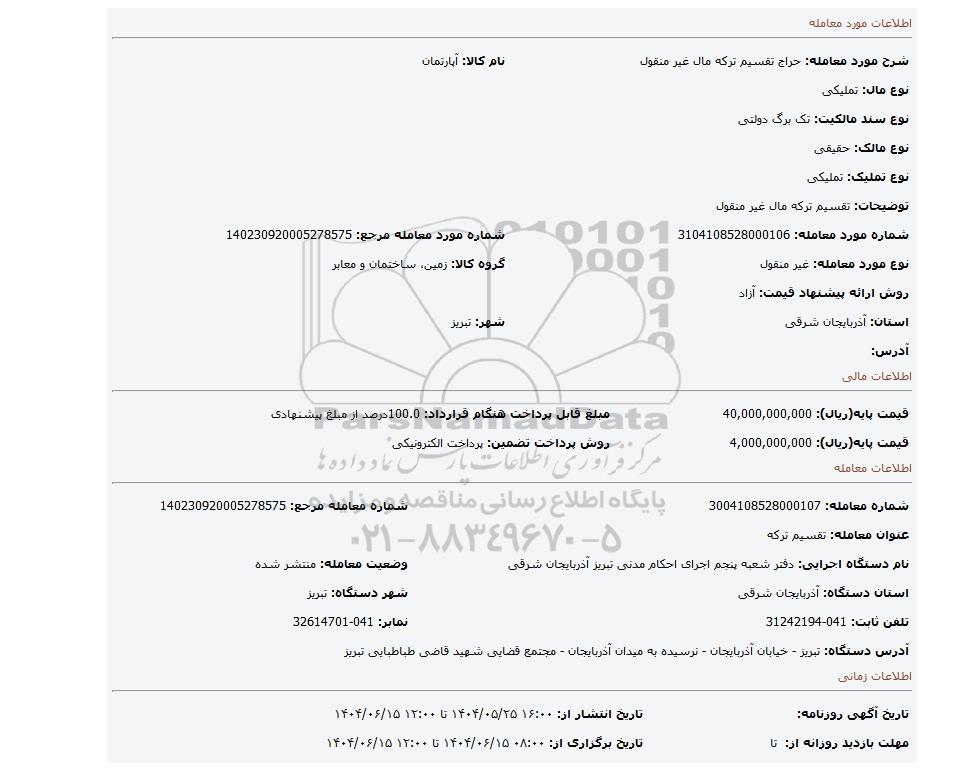 | شرح مورد معامله: حراج تقسیم ترکه مال غیر منقول | نام کالا: آپارتمان | |