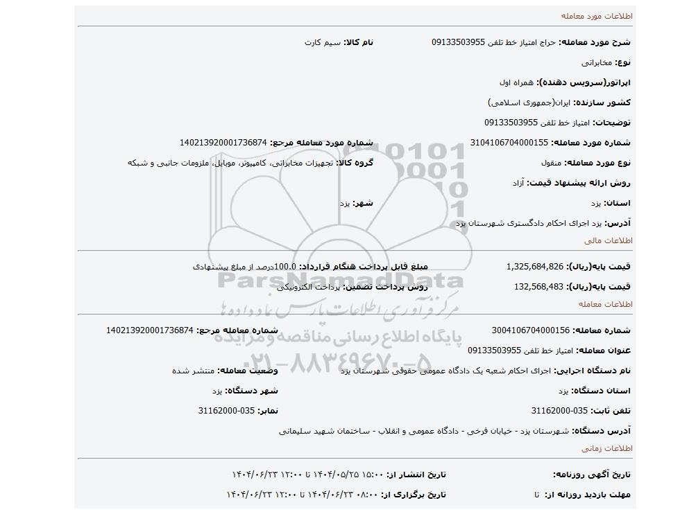 مزایده امتیاز خط تلفن 09133503955, مزایده، امتیاز خط تلفن 09133503955