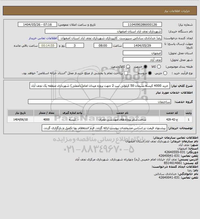 شرح کلی نیاز: خرید 4000 کیسه سیمان 50 کیلوئی تیپ 2 جهت پروژه میدان امام(باغملی) شهرداری منطقه یک نجف آباد