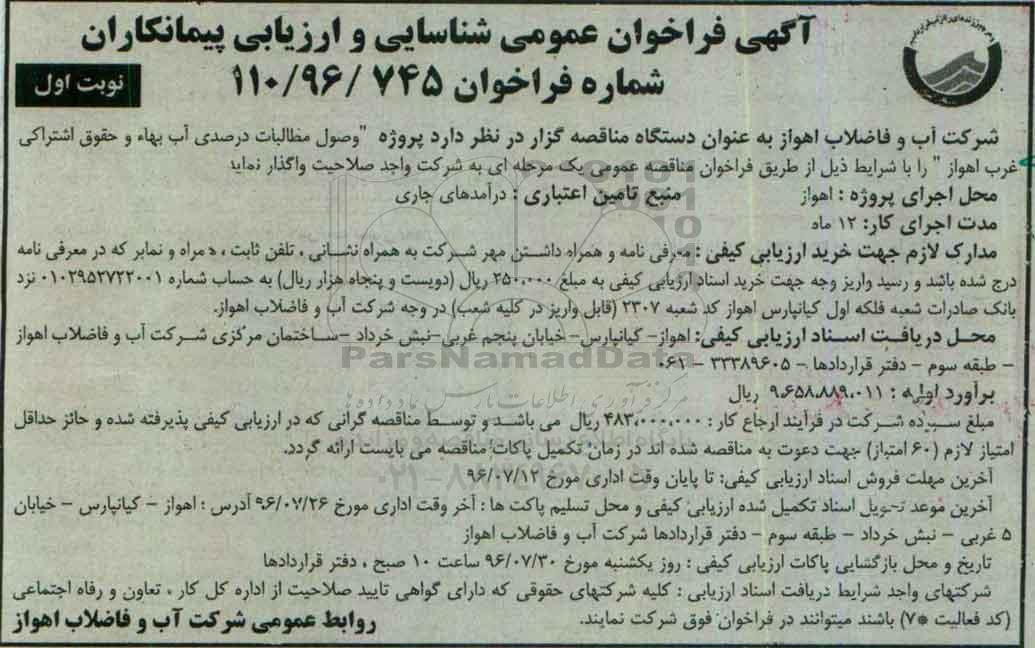 فراخوان پروژه وصول مطالبات درصدی آب بهاء و حقوق اشتراکی غرب, آگهی فراخوان عمومی شناسایی و ارزیابی پیمانکاران، فراخوان پروژه وصول مطالبات درصدی آب بهاء و حقوق اشتراکی غرب