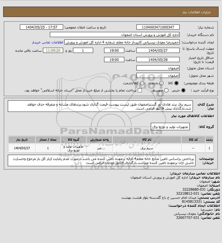 شرح کلی نیاز: سیم برق برند هادی نور گستراصفهان طبق لیست پیوست قیمت گذاری شود.برندهای مشابه و متفرقه حذف خواهد شد.بارگذاری پیش فاکتور الزامی است.