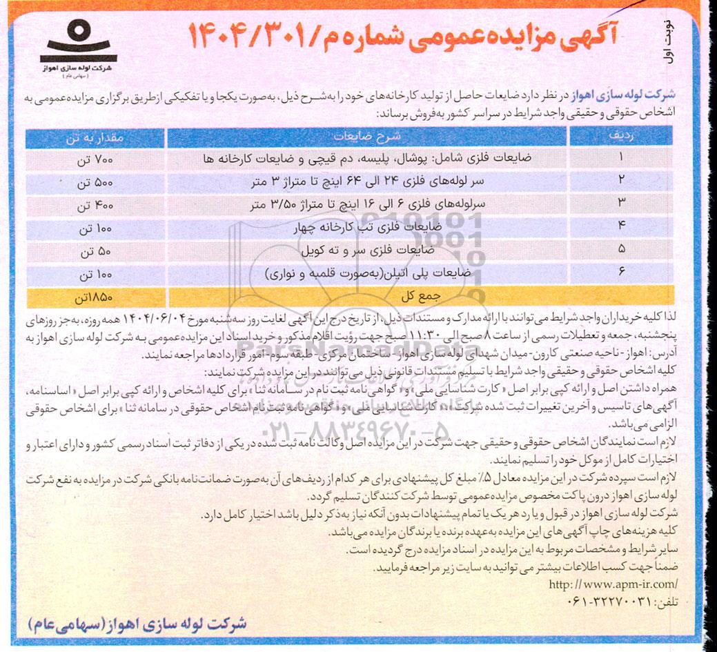 شرکت لوله سازی اهواز (سهامی عام) در نظر دارد ضایعات حاصل از تولید کارخانه های خود را به شرح ذیل به صورت یکجا و یا تفکیکی از طریق برگزاری مزایده عمومی به اشخاص حقوقی یا حقیقی واجد شرایط در سراسر کشور به فروش برساند :