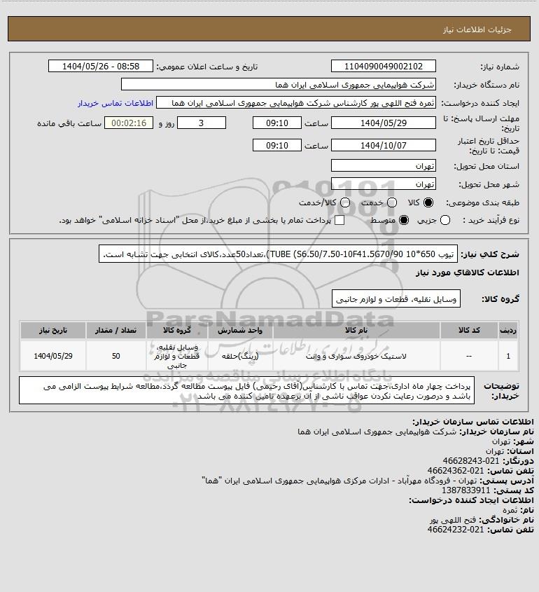 استعلام تیوب 650*10 TUBE (S6.50/7.50-10F41.5G70/90)تعداد50عددکالای انتخابی جهت تشابه است., استعلام تیوب 650*10 TUBE (S6.50/7.50-10F41.5G70/90)،تعداد50عدد،کالای انتخابی جهت تشابه است.