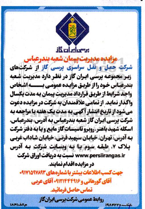 شرکت حمل و نقل سراسری پرسی گاز از شرکتهای زیر مجموعه پرسی ایران گاز در نظر دارد مدیریت شعبه بندر عباس خود را از طریق مزایده عمومی به اشخاص واجد شرایط از طریق قرارداد مدیریت پیمان به مدت یکسال واگذار نماید. از تمامی علاقمندان به شرکت در مزایده دعوت میشود از تاریخ انتشار آگهی به مدت یک هفته با مراجعه به شرکت پرسی ایران گاز شعبه بندرعباس به آدرس بندر عباس اسکله شهید باهنر روبرو تاسیسات گاز مایع و یا به دفتر شرکت به آدرس: تهران خیابان سپهبد قرنی، خیابان شاداب غربی پلاک 7 طبقه سوم یا به وبسایت شرکت به آدرس نسبت به دریافت اوراق شرکت www.persiirangas.ir در مزایده اقدام نمایند.
