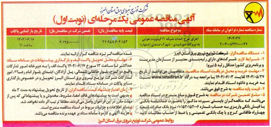 اجرای طرح احداث شبکه 20 کیلوولت هوایی به نیروگاه خورشیدی - شهرک صنعتی اشتهارد 34.958.604.153 3.175.000.000 1404.6.18 ساعت 11