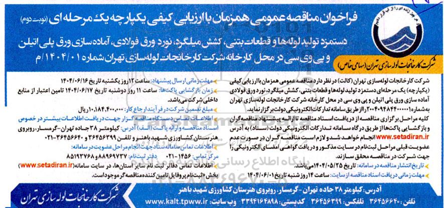 دستمزد تولید لوله ها و قطعات بتنی ، کشش میلگرد ، نورد ورق فولادی و اماده سازی ورق پلی اتیلن و پی وی سی در محل کارخانه شرکت کارخانجات لوله سازی تهران شماره 01/ 1404/ م