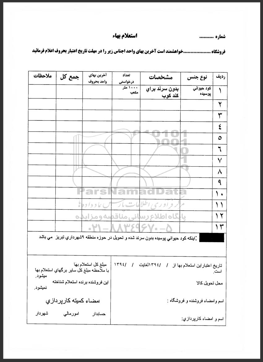 اینکه کود حیوانی پوسیده بدون سرند شده و تحویل در حوزه منطقه 9 شهرداری تبریز می باشد.