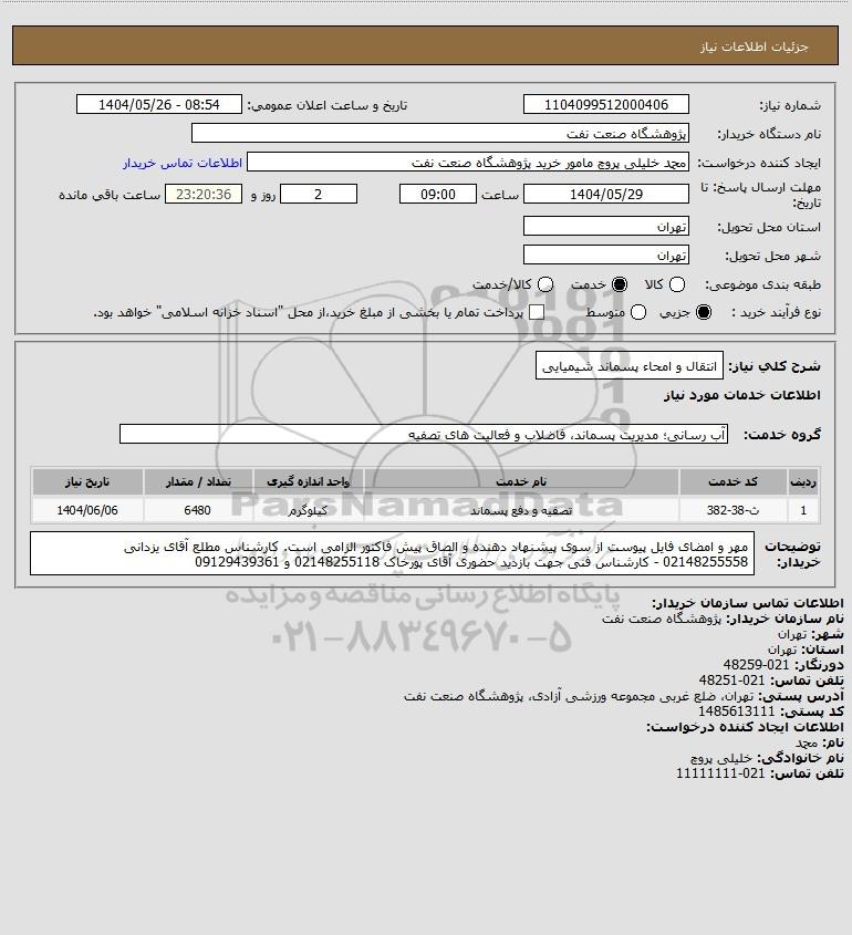 شرح کلی نیاز: انتقال و امحاء پسماند شیمیایی