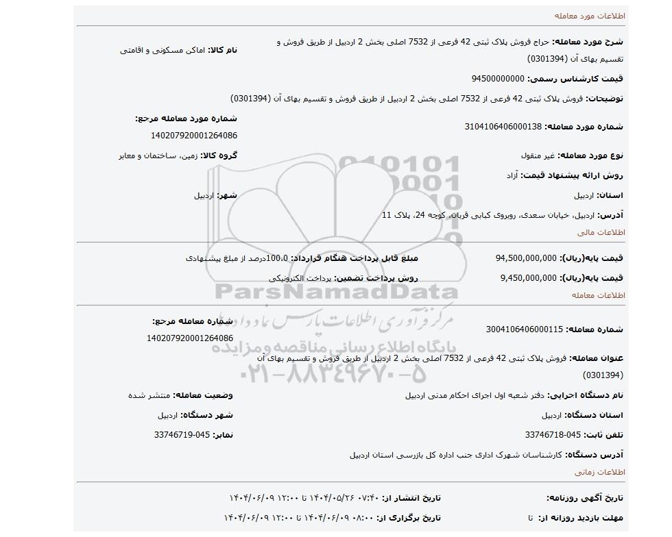 عنوان معامله: فروش پلاک ثبتی 42 فرعی از 7532 اصلی بخش 2 اردبیل از طریق فروش و تقسیم بهای آن (0301394) | ||