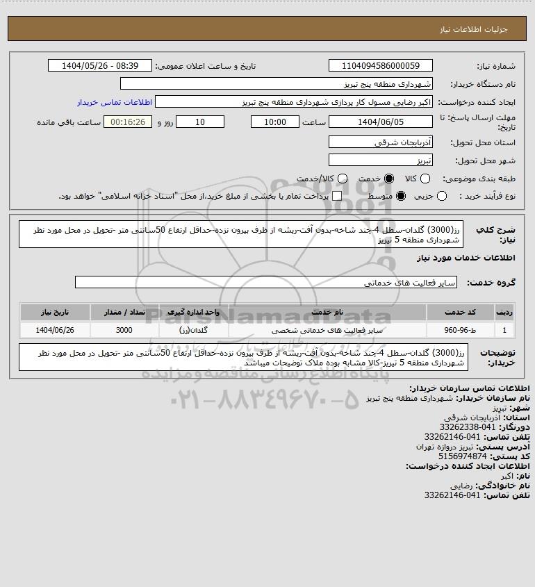 شرح کلی نیاز: رز(3000) گلدان-سطل 4-چند شاخه-بدون آفت-ریشه از ظرف بیرون نزده-حداقل ارتفاع 50سانتی متر -تحویل در محل مورد نظر شهرداری منطقه 5 تیریز