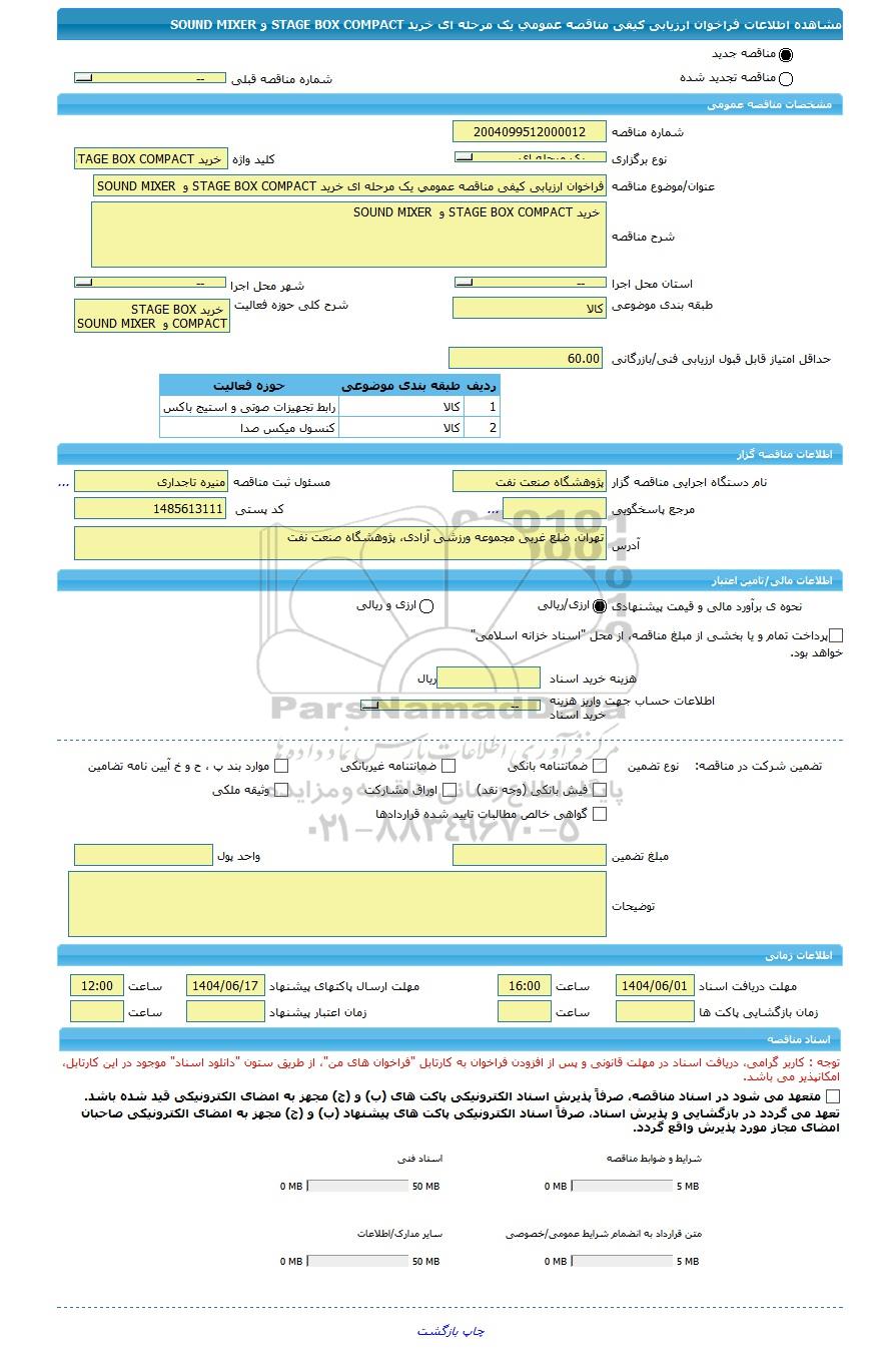 | شرح مناقصه | خرید STAGE BOX COMPACT و SOUND MIXER | |||||||||||
