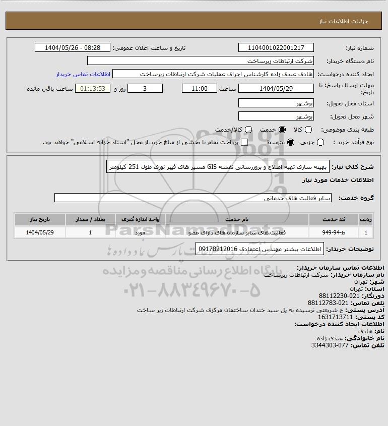 شرح کلی نیاز: بهینه سازی تهیه اصلاح و بروزرسانی نقشه GIS مسیر های فیبر نوری طول 251 کیلومتر