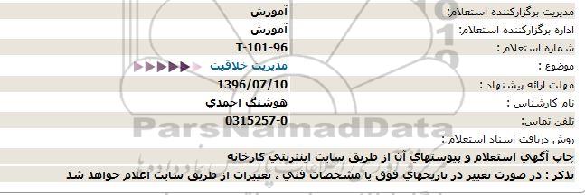استعلام بها و موضوع استعلام استعلام , استعلام مدیریت خلاقیت به اطلاع کلیه شرکتها و افراد متخصص واجد شرایط میرساند، آگهی گذار در نظر دارد از طریق استعلام بها، نسبت به انتخاب و دریافت پیشنهادات اقدام نماید. این استعلام با کد آگهی ثبت شده در سامانه خبرگزاری پارس نماد : 941649 منتشر شده است. مشخصات استعلام : تاریخ شروع استعلام: 1396/07/03 آخرین مهلت ارسال پیشنهاد قیمت : 1396/07/10 و محل اجرای پروژه : استان اصفهان میباشد. استعلام قیمت مورد درخواست : استعلام , استعلام مدیریت خلاقیت با دستهبندیهای تخصصی و گروه های مرتبط : مشاوره تحقیقات و مدیریت استاندارد, استعلام اطلاع رسانی میگردد.