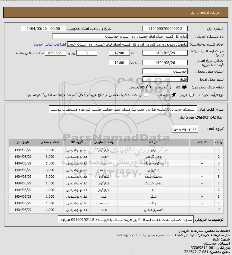 شرح کلی نیاز: استعلام خرید 1000بسته غذایی جهت نیاز مندان تحت حمایت حسب شرایط و مشخصات پیوست