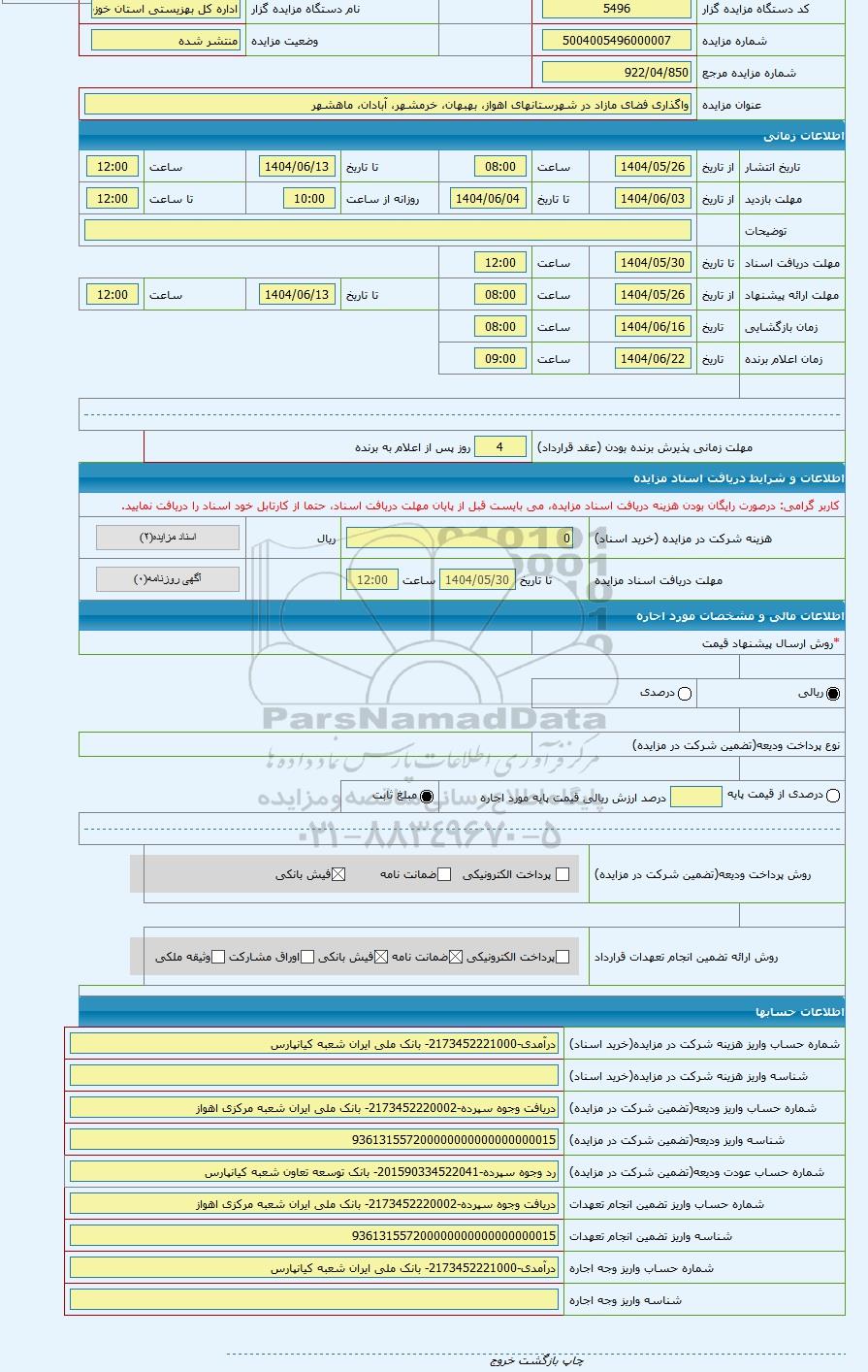 | شماره مورد اجاره | 5104005496000034 | نوع برگزاری مزایده | مزایده عمومی | |