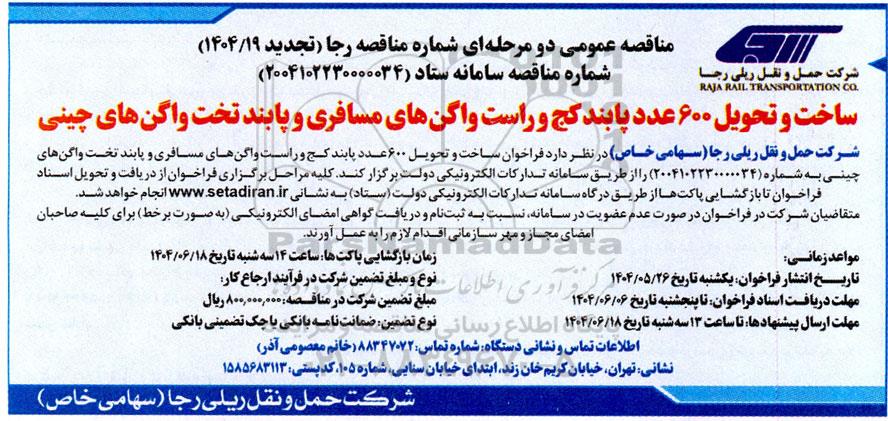 شرکت حمل و نقل ریلی رجا (سهامی خاص) در نظر دارد فراخوان ساخت و تحویل 600 عدد پابند کج و راست واگن های مسافری و پابند تخت واگن های چینی به شماره 2004102230000034 را از طریق سامانه تدارکات الکترونیکی دولت برگزار نماید. کلیه مراحل برگزاری فراخوان از دریافت و تحویل اسناد فراخوان تا بازگشایی پاکتها از طریق درگاه سامانه تدارکات الکترونیک دولت ستاد به ادرس سایت ستاد انجام خواهد شد. متقاضیان شرکت در فراخوان در صورت عدم عضویت در سامانه نسبت به ثبت نام و دریافت گواهی امضای الکترونیکی به صورت برخط برای کلیه صاحبان امضای مجاز و مهر سازمانی اقدام لازم را بعمل اورند.