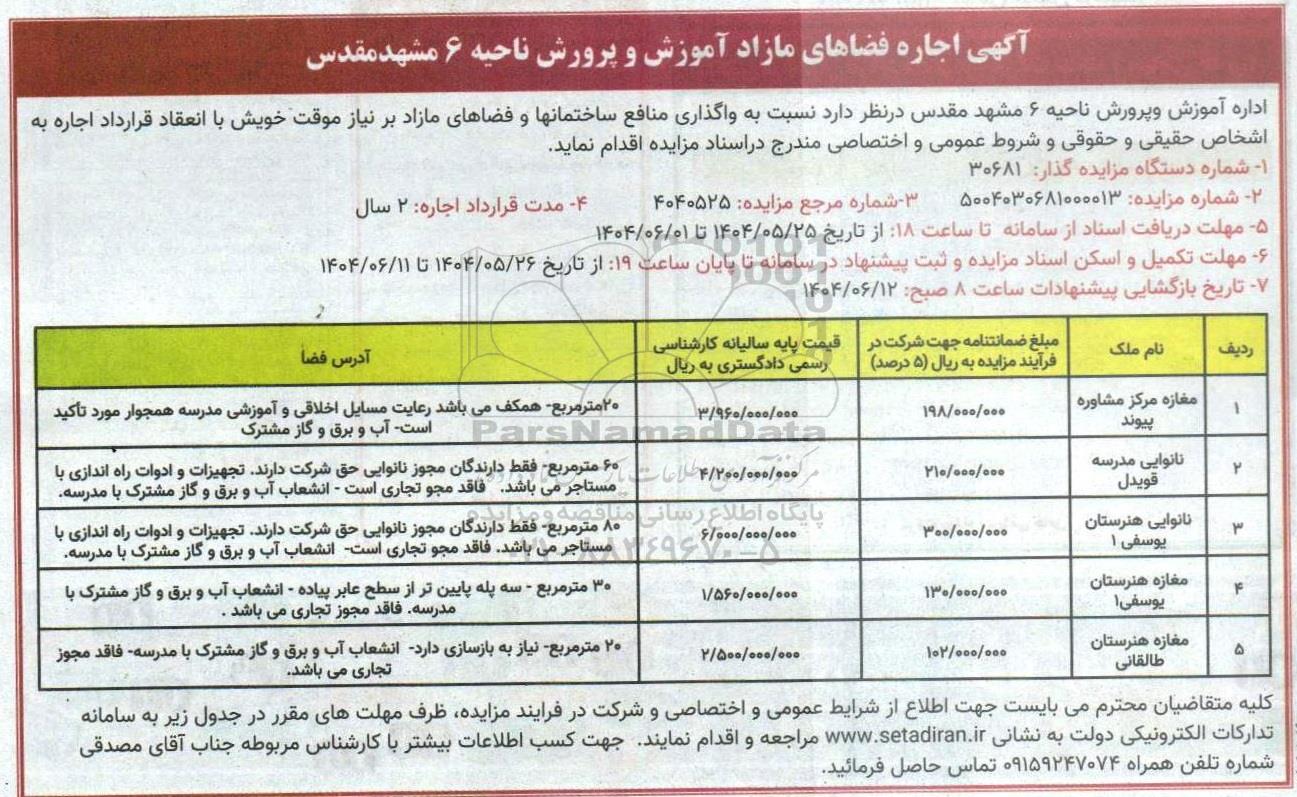 آگهی اجاره فضاهای مازاد آموزش و پرورش ناحیه 6 مشهد مقدس