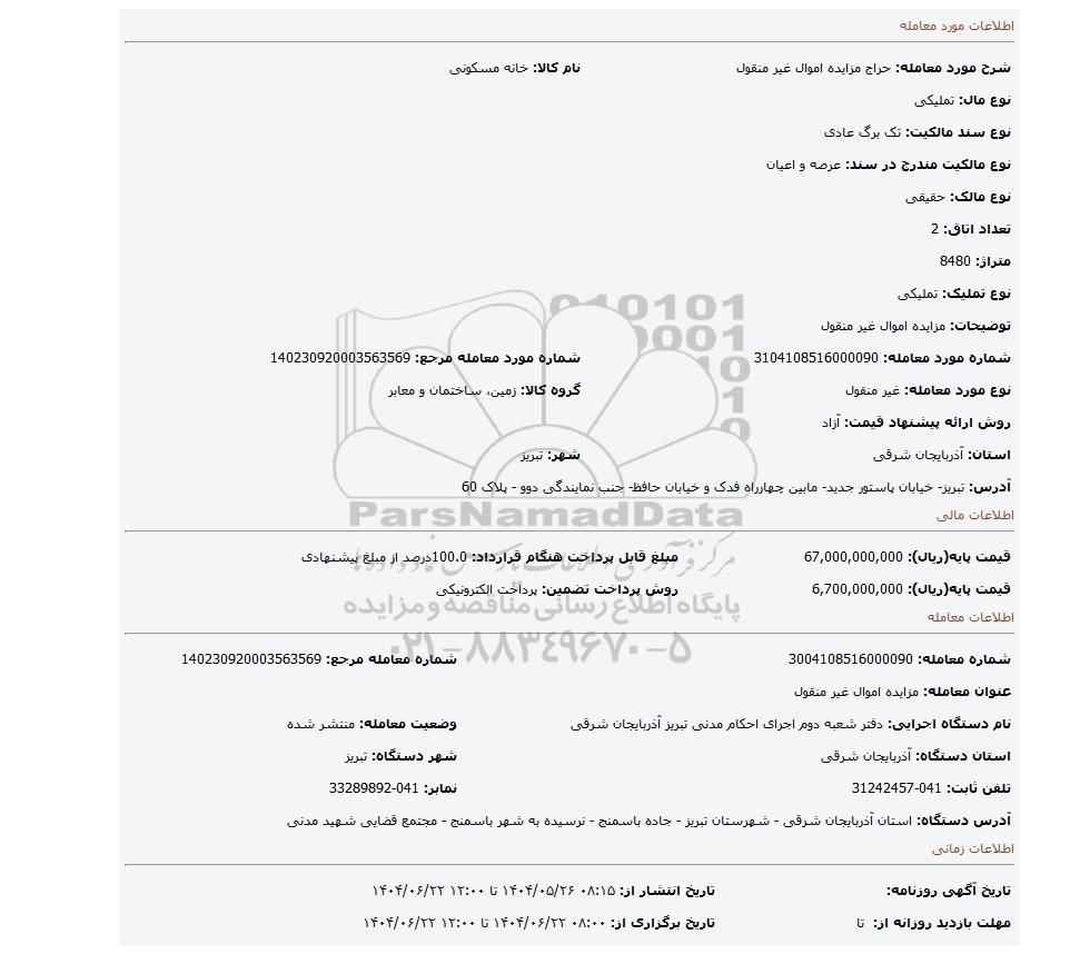 9 مزایده دستور فروش ملک مشاعی 9810687 1404/08/15 new not special not payed آذربایجان شرقی