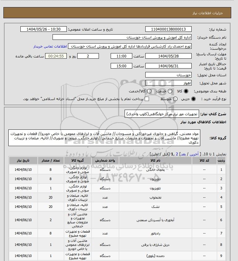 شرح کلی نیاز: تجهیزات مور نیاز مرکز خوابگاهی(کلوپ واحدی)