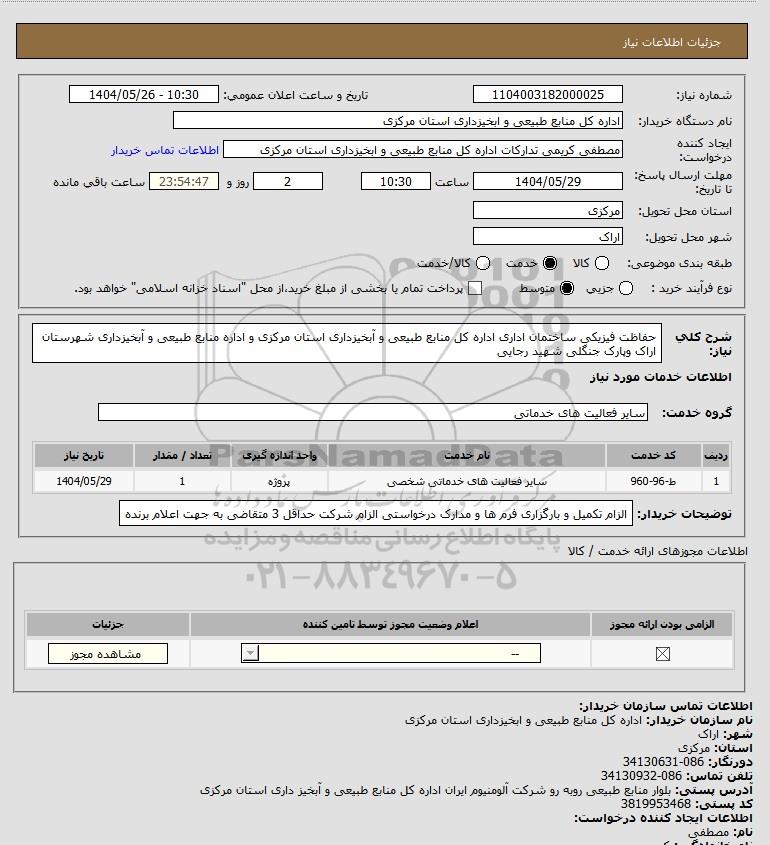 شرح کلی نیاز: حفاظت فیزیکی ساختمان اداری اداره کل منابع طبیعی و آبخیزداری استان مرکزی و اداره منابع طبیعی و آبخیزداری شهرستان اراک وپارک جنگلی شهید رجایی