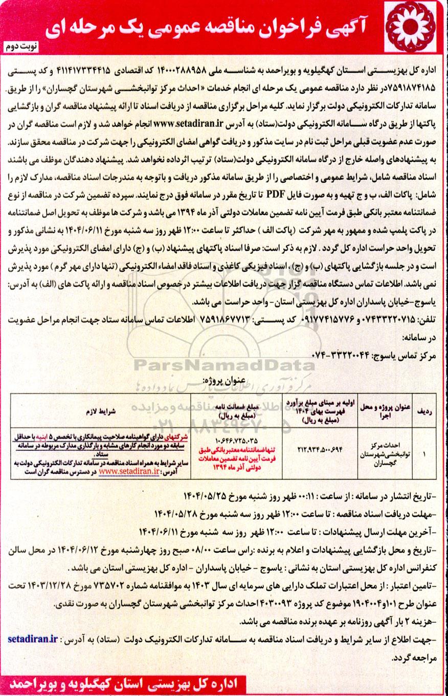 آگهی فراخوان احداث مرکز توانبخشی شهرستان گچساران- نوبت دوم, آگهی فراخوان احداث مرکز توانبخشی شهرستان گچساران- نوبت دوم