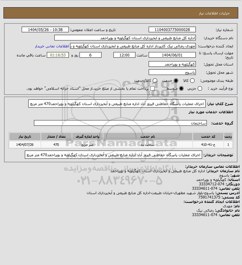 شرح کلی نیاز: اجرای عملیات پاسگاه حفاظتی فیروز آباد اداره منابع طبیعی و آبخیزداری استان کهگیلویه و بویراحمد470 متر مربع