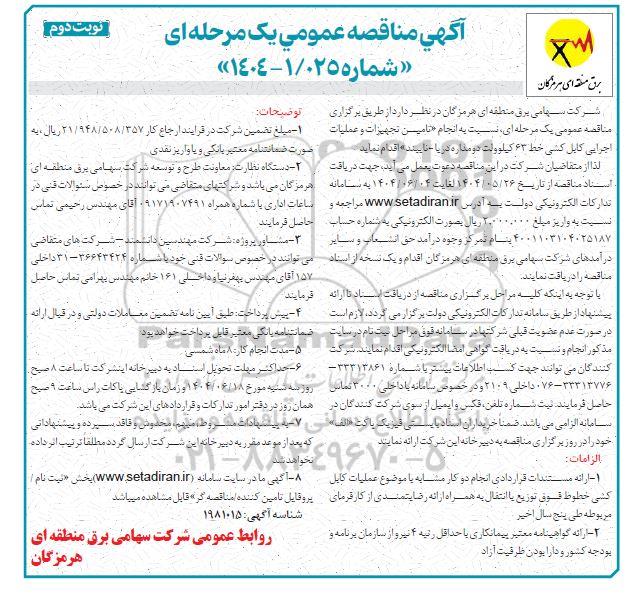 آگهی مناقصه عمومی یک مرحله ای - شماره 1/025-1404 نوبت دوم