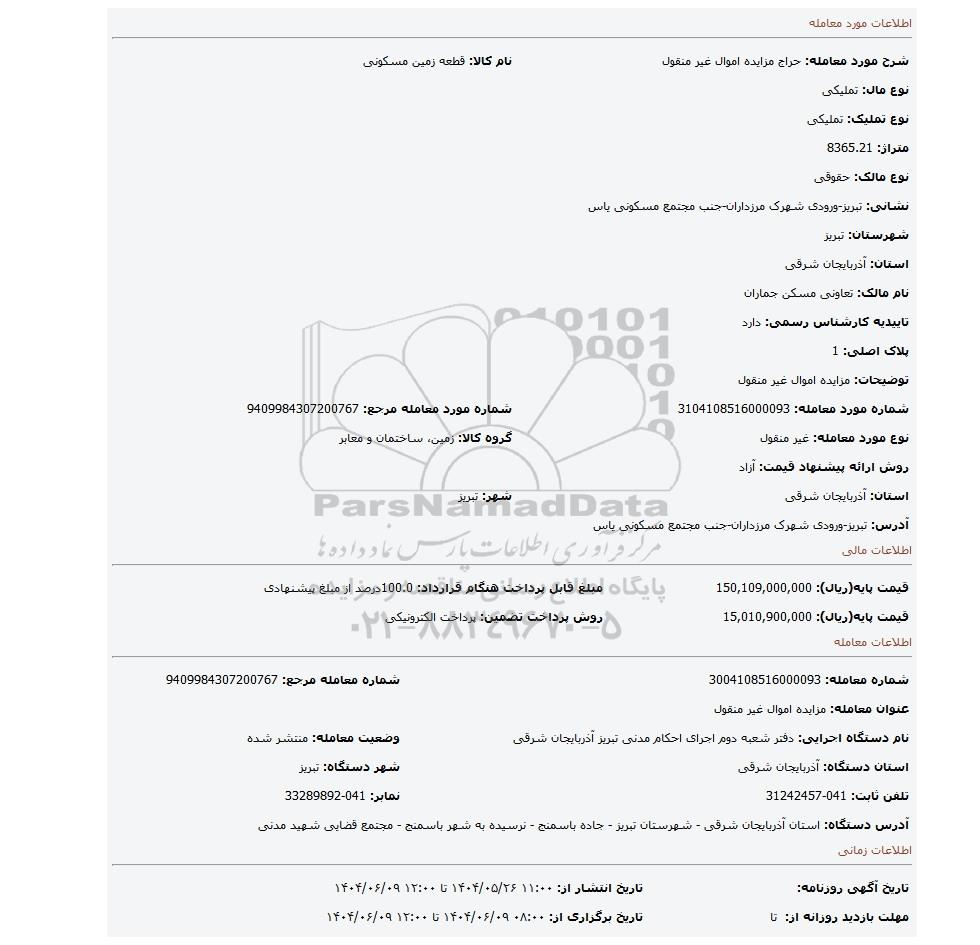 9 مزایده دستور فروش ملک مشاعی 9810687 1404/08/15 new not special not payed آذربایجان شرقی