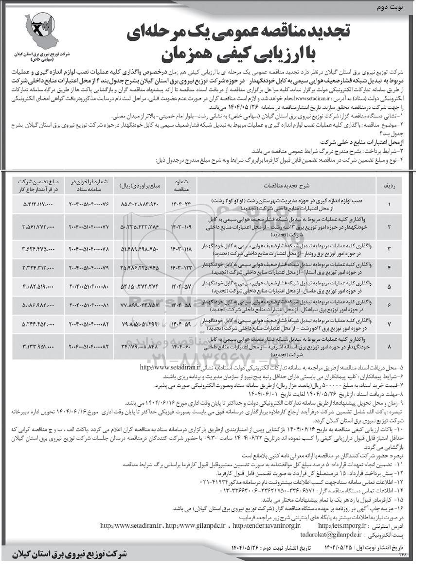 | 8 | واگذاری کلیه عملیات مربوط به تبدیل شبکه فشار ضعیف هوایی سیمی به کابل خودنگهدار در حوزه امور توزیع برق آستانه اشرفیه - از محل اعتبارات منابع داخلی شرکت (تجدید) | 1404-60 | 34.179.008.848 | 2004005104000083 | 3.133.951.000 |