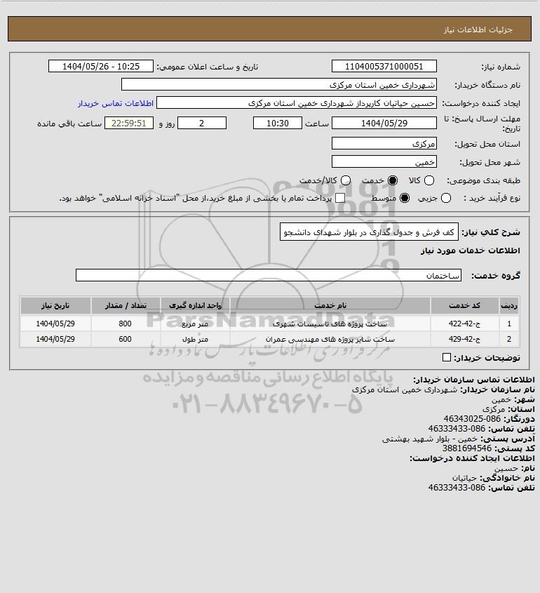 شرح کلی نیاز: کف فرش و جدول گذاری در بلوار شهدای دانشجو