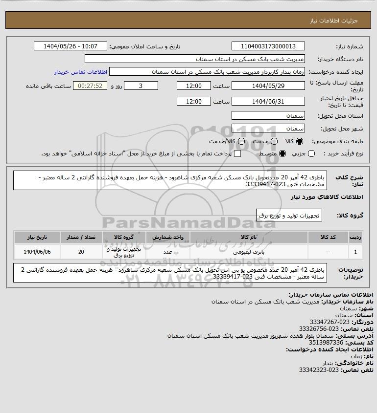 استعلام باطری 42 آمپر 20 عددتحویل بانک مسکن شعبه مرکزی شاهرود - هزینه حمل بعهده فروشنده گارانتی 2 ساله معتبر - مشخصات فنی 023-33339417, استعلام باطری 42 آمپر 20 عددتحویل بانک مسکن شعبه مرکزی شاهرود - هزینه حمل بعهده فروشنده گارانتی 2 ساله معتبر - مشخصات فنی 023-33339417