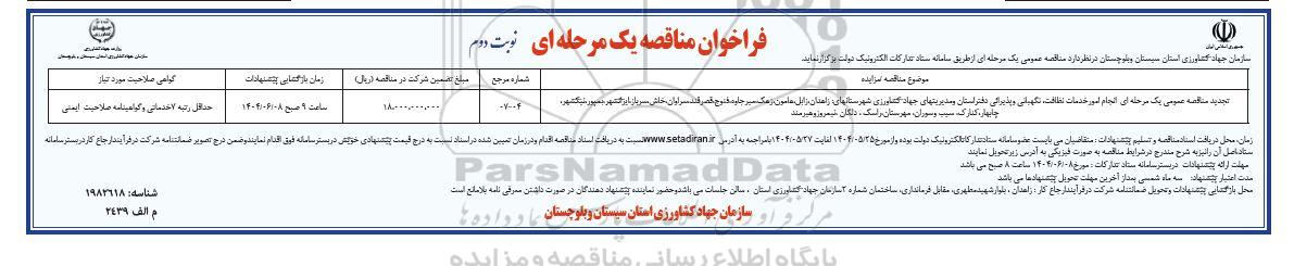 | 1 | مناقصه عمومی یک مرحله ای انجام امور خدمات نظافت، نگهبانی و پذیرائی دفتر استان و مدیریت های جهاد کشاورزی شهرستانهای: زاهدان ، زابل، هامون ، زهک ، میرجاوه، فنوج، قصرقند، سراوان ، خاش، سرباز، ایرانشهر بمپور، نیکشهر ، چابهار ، کنارک، سیب و سوران مهرستان، راسک ، دلگان، نیمروز و هیرمند | 04-07 | 18.000.000.000 | ساعت 9 صبح مورخ 1404.6.8 | حداقل رتبه 7 خدماتی و گواهی نامه صلاحیت ایمنی |