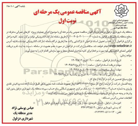 منطقه یک شهرداری دزفول در نظر دارد فراخوان مناقصه عمومی یک مرحله ای با موضوع اجرای عملیات پروژه کارهای عمرانی متفرقه در سطح منطقه یک شهرداری دزفول به شماره 2004050301000030 را از طریق سامانه تدارکات الکترونیکی دولت برگزار نماید. کلیه مراحل برگزاری فراخوان از دریافت و تحویل اسناد فراخوان تا بازگشایی پاکت ها از طریق درگاه سامانه تدارکات الکترونیکی دولت (ستاد) به آدرس ستاد ایران انجام خواهد شد. متقاضیان شرکت در فراخوان در صورت عدم عضویت در سامانه ، نسبت به ثبت نام و دریافت گواهی امضای الکترونیکی به صورت برخط برای کلیه صاحبان امضای مجاز و مهر سازمانی اقدام لازم را به عمل آورند .