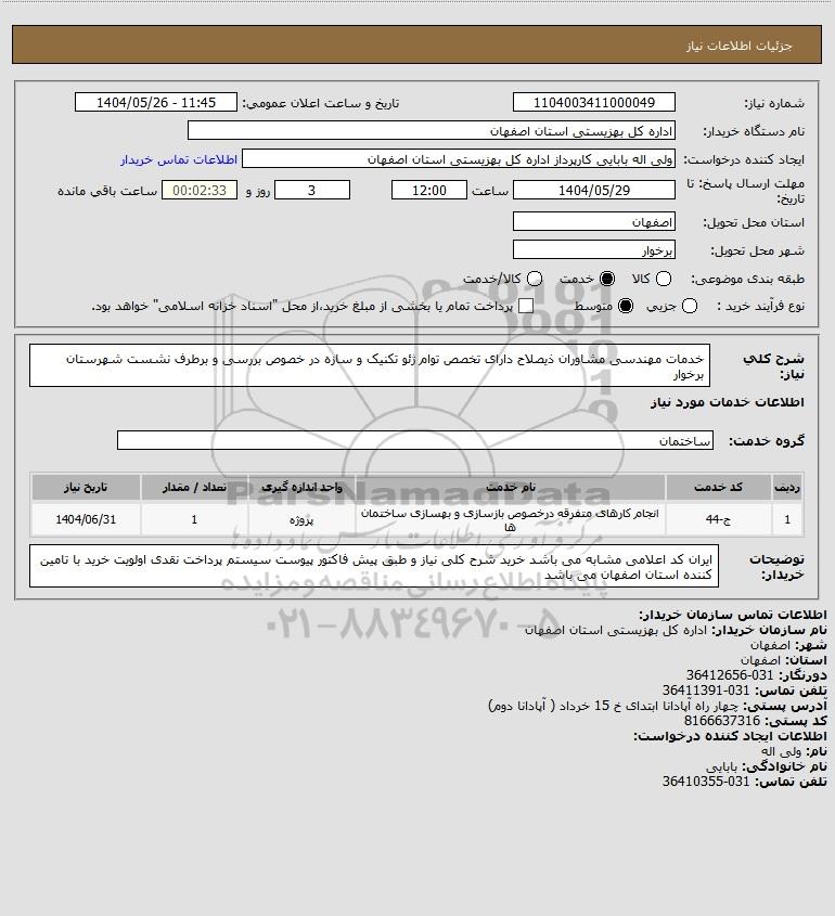 شرح کلی نیاز: خدمات مهندسی مشاوران ذیصلاح دارای تخصص توام ژئو تکنیک و سازه در خصوص بررسی و برطرف نشست شهرستان برخوار