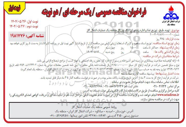 موضوع: تهیه، طبخ، سرو و توزیع غذای رستوران تنگ پیرزال منطقه یک عملیات انتقال گاز