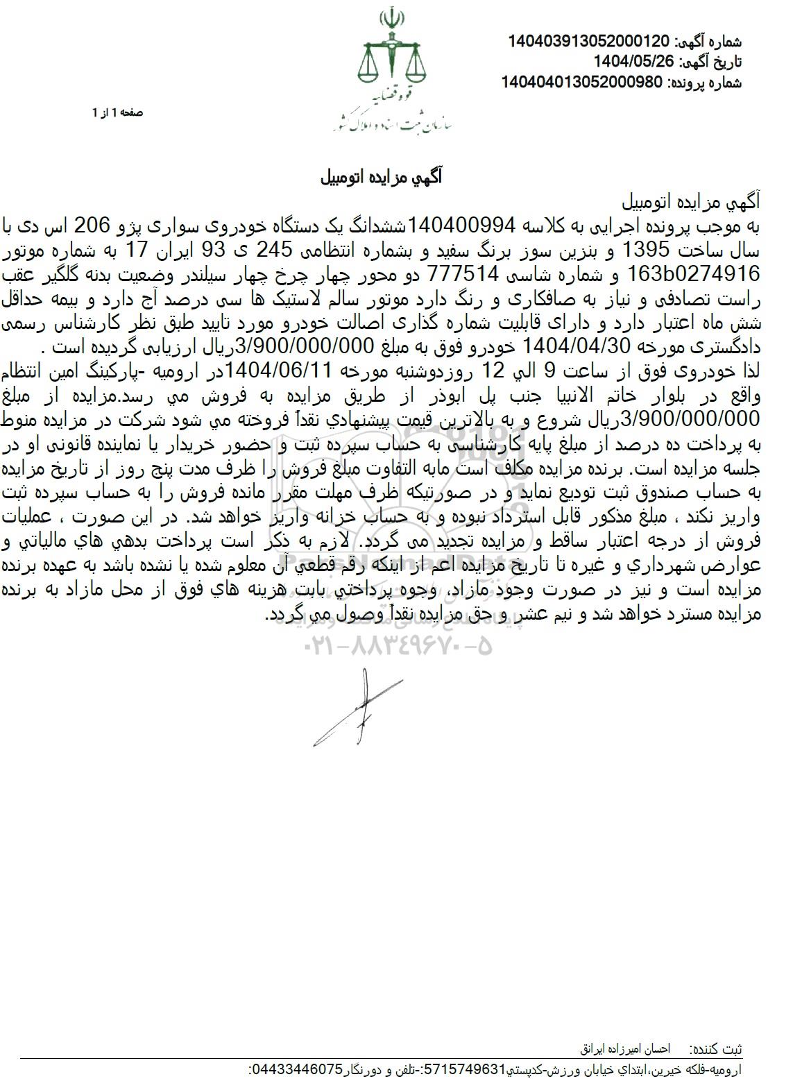 مزایده فروش یک دستگاه خودرو پژو 206 مدل 1395