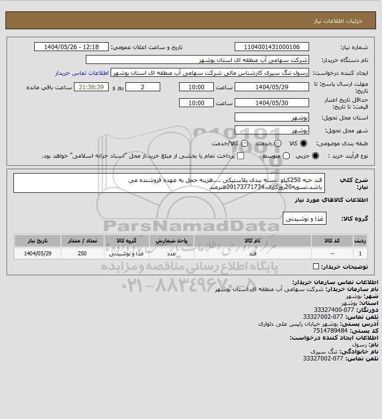 شرح کلی نیاز: قند حبه 250کیلو .بسته بندی پلاستیکی ....هزینه حمل به عهده فروشنده می باشد.تسویه20روزکاری.09173771734هنرمند