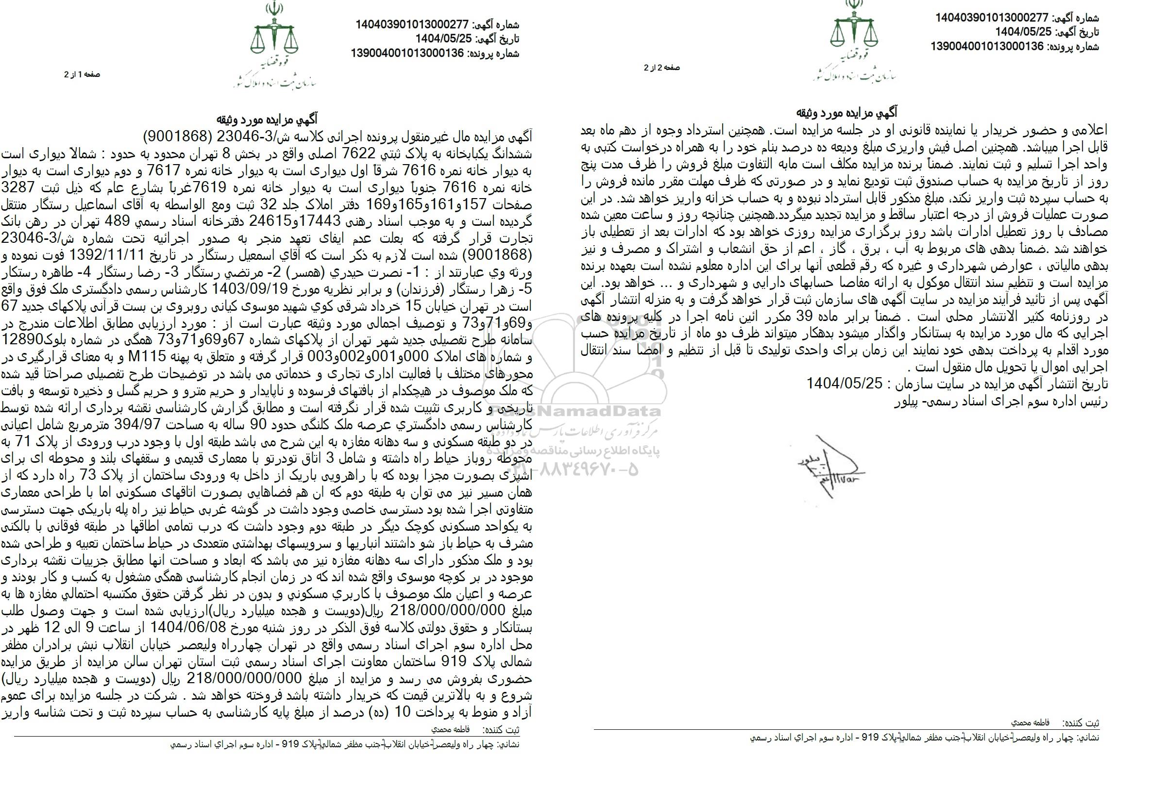 تاریخ مزایده روز شنبه مورخ 1404.06.08 از ساعت 9 الی 12 ظهر در محل اداره سوم اجرای اسناد رسمی واقع در تهران چهارراه ولیعصر خیابان انقلاب نبش برادران مظفر شمالی پلاک 919 ساختمان معاونت اجرای اسناد رسمی ثبت استان تهران