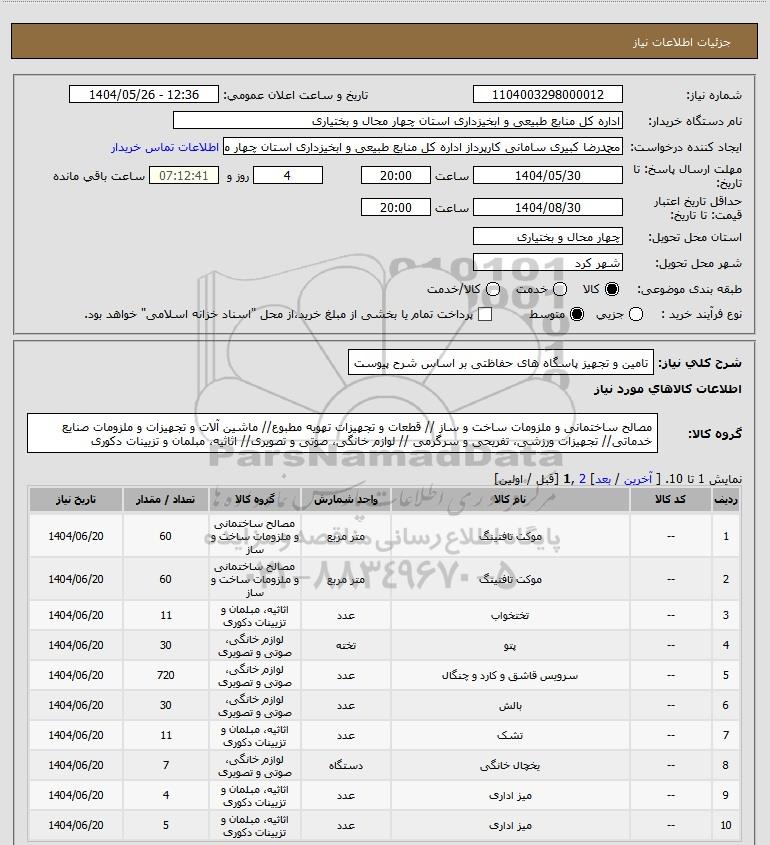شرح کلی نیاز: تامین و تجهیز پاسگاه های حفاظتی بر اساس شرح پیوست