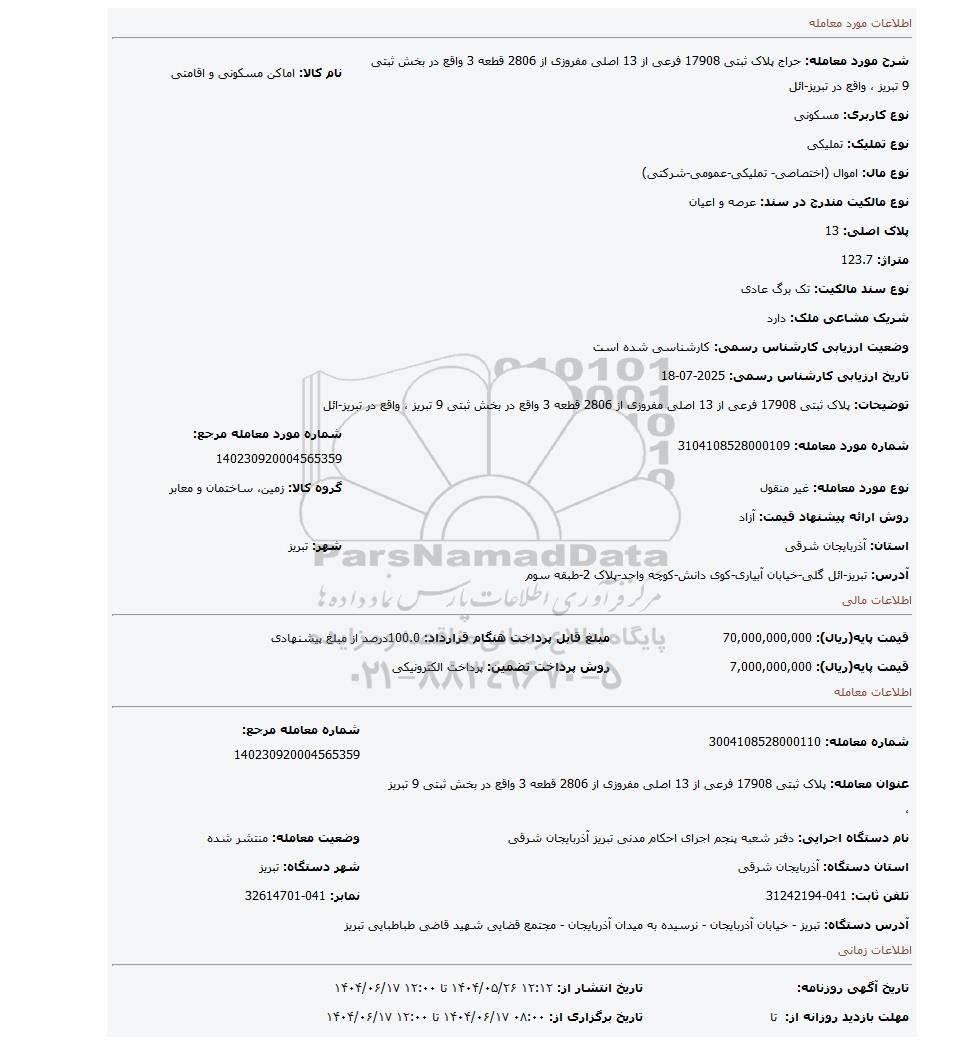 | شرح مورد معامله: حراج پلاک ثبتی 17908 فرعی از 13 اصلی مفروزی از 2806 قطعه 3 واقع در بخش ثبتی 9 تبریز ، واقع در تبریز-ائل | نام کالا: اماکن مسکونی و اقامتی | |