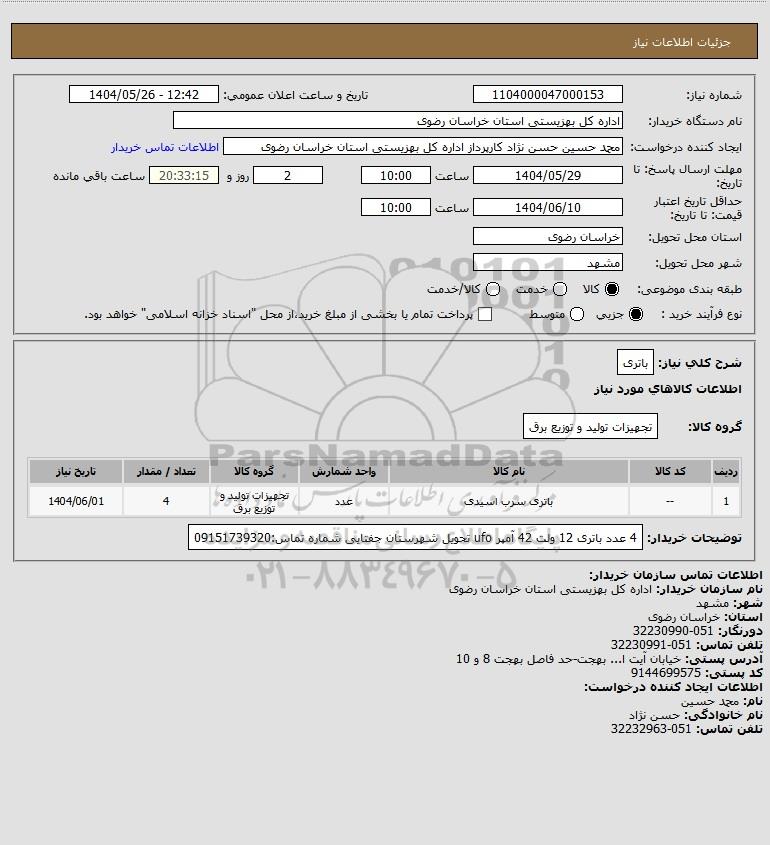 | 1 | -- | باتری سرب اسیدی | عدد | تجهیزات تولید و توزیع برق | 4 | 1404/06/01 |