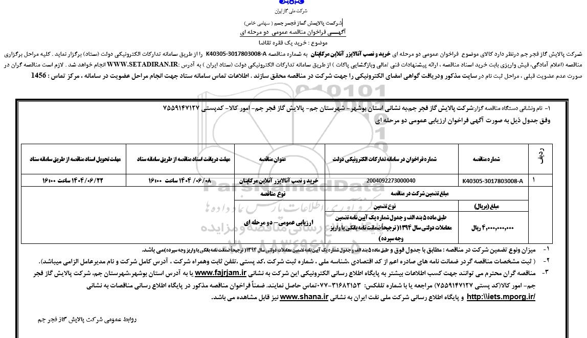 شرکت پالایش گاز فجر جم در نظر دارد کالای موضوع فراخوان عمومی دو مرحله ای خرید و نصب آنالایزر آنلاین مرکاپتان به شماره مناقصه -3017803008-K40305 را از طریق سامانه تدارکات الکترونیکی دولت (ستاد) برگزار نماید. کلیه مراحل برگزاری مناقصه اعلام آمادگی، فیش واریزی بابت خرید اسناد مناقصه، ارائه پیشنهادات فنی مالی و بازگشایی پاکات از طریق سامانه تدارکات الکترونیکی دولت ستاد ایران به آدرس ستاد ایران انجام خواهد شد. لازم است مناقصه گران در صورت عدم عضویت قبلی ، مراحل ثبت نام در سایت مذکور و دریافت گواهی امضای الکترونیکی را جهت شرکت در مناقصه محقق سازند. اطلاعات تماس سامانه ستاد جهت انجام مراحل عضویت در سامانه ، مرکز تماس : 1456